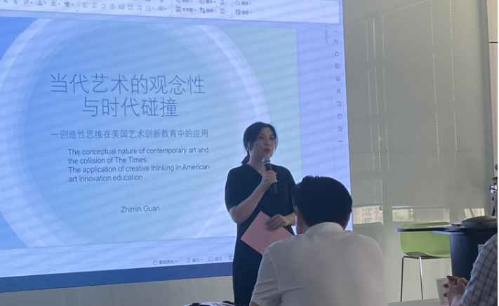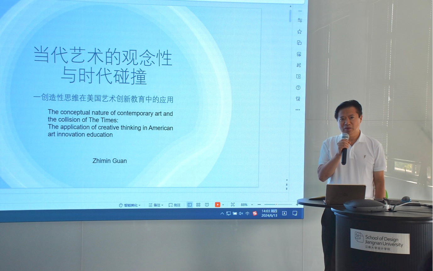 关智民教授以其深厚的学术底蕴和丰富的实践经验,为师生们带来了一场精彩的学术盛宴。他从美国艺术博物馆、拍卖会及展览活动、艺术画廊、当代艺术观念性与时代碰撞等多维度视角出发,深入剖析了美国高等美术教育的创新机制,揭示了当代艺术的最新发展动态和前沿理念。通过一系列标志性的艺术作品和事件,串联起美国当代艺术的发展脉络,展现了当代艺术在社会变迁中的变革。