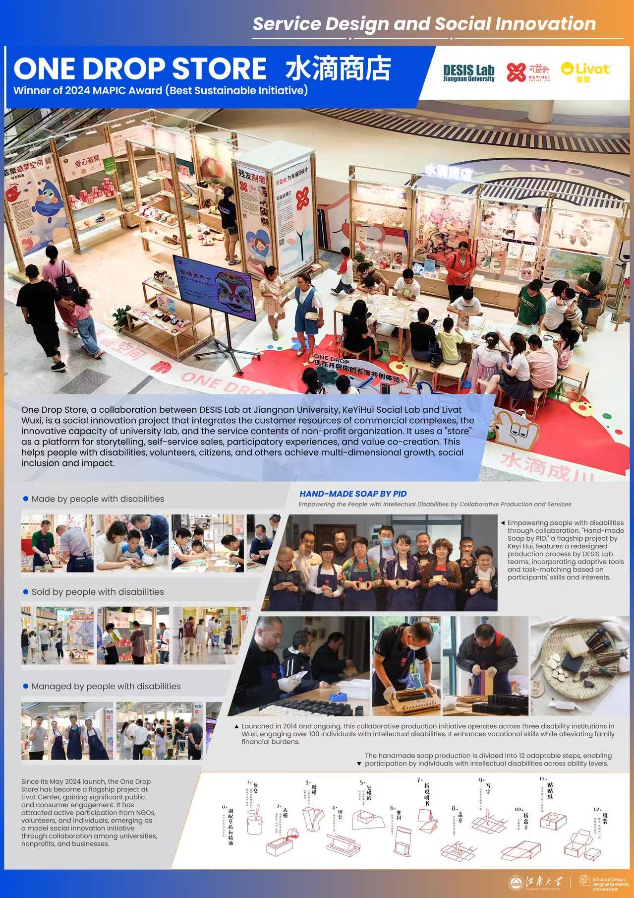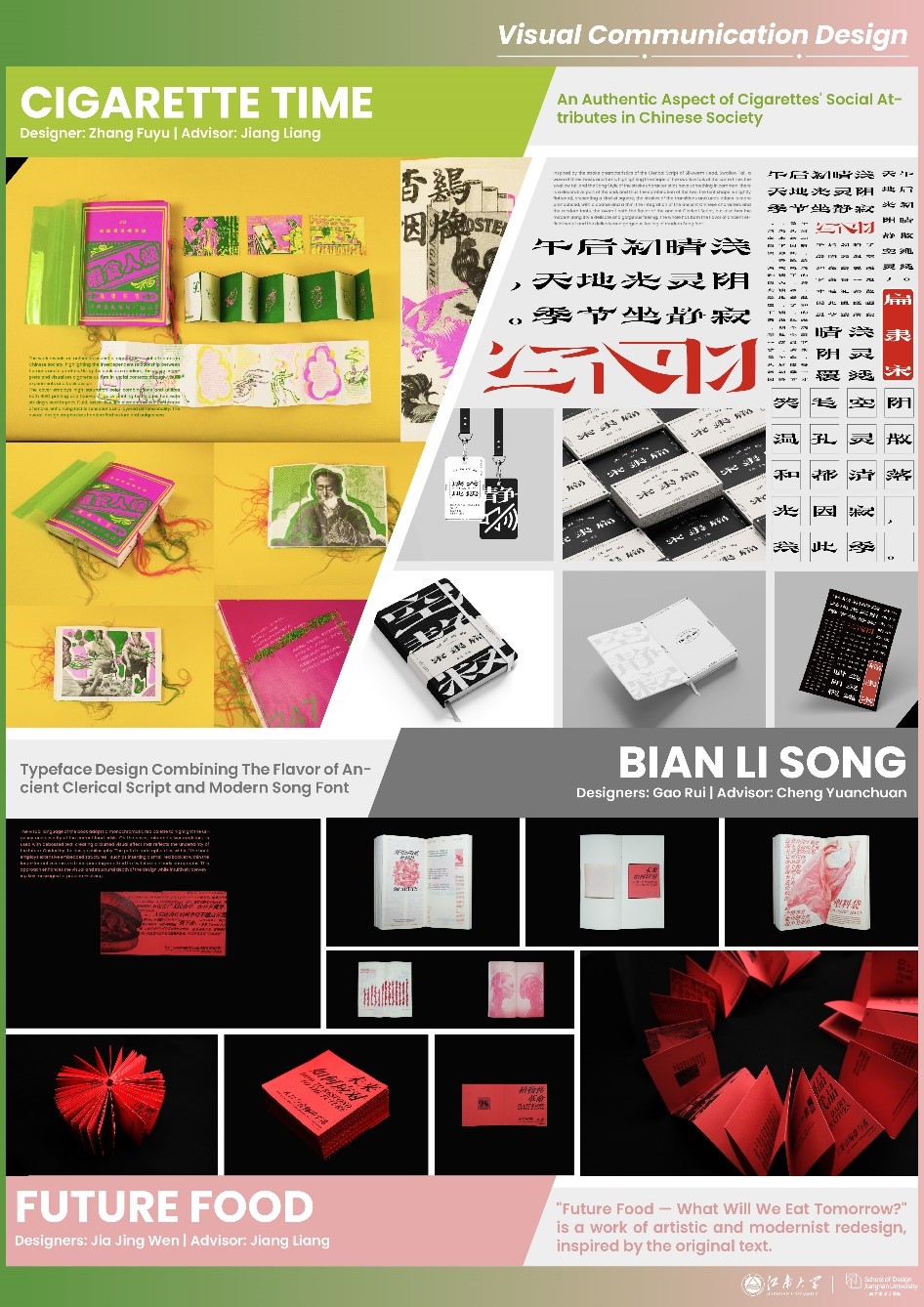 参展。其中获奖作品有:医疗产品与系统设计优秀作品:《MediCruise——ICU场景下的模块化运输及整合系统设计》、《迈乐S-Mile脑卒中智能居家监测训练系统》,服务设计与社会创新优秀作品:《水滴商店》,视觉传达设计优秀作品:《未来食物——明天我们吃什么》、《暇食人烟》、《扁隶宋》,环境系统设计优秀作品:《无锡水情教育基地景观设计》,公共艺术与数字创新方向优秀作品:《植愈花园》、《敦煌奇妙夜》。