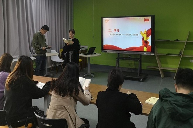 互党支部书记卢晓凯围绕“三个为什么”学、抓住“三条线索”学、把握“三项重点工作”学,分享了自己学习党史的心得体会;创业党支部书记饶锎月传达了学院党委关于党史学习教育的相关要求和工作安排,并就创业党支部和交互党支部党史学习工作的后续开展计划做了介绍,从扎实有序推进,营造浓厚氛围着手,严格落实规定动作,创新开展自选动作,高标准完成党史学习教育这一重大政治任务。