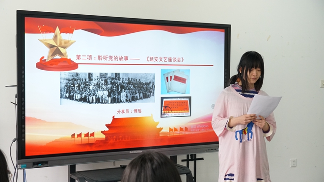 支部党员王冰从中国共产党诞生、新中国成立、改革开放、中国特色社会主义新时代四个历史时期带领同学们深入学习中华民族在党的领导下筚路蓝缕、波澜壮阔的艰辛发展历程。张晨薇回顾了中国纺织服装行业在党的领导下实现“跟跑”、“并跑”到“领跑”的伟大跨越,中国纺织工业体系从无到有,由弱到强的光辉历程。傅瑶结合《延安文艺座谈会》和习近平总书记文艺工作座谈会重要讲话精神,从专业发展出发,阐述文艺工作在增强民族文化自信的重要性,坚定身为未来服装设计师的历史使命与担当。