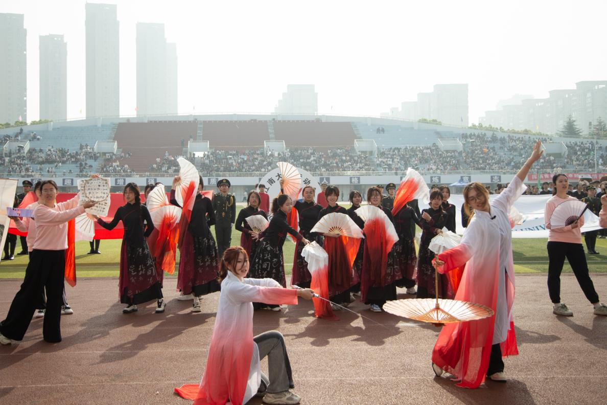 步伐铿锵如鼓点,口号嘹亮似惊雷,手持创意道具,红白衣袂曳霞光,设院师生一出场,瞬间点燃全场热情。方阵表演中古典舞与现代韵律交织,伏身似燕掠水,展臂如鹤凌霄,将设计之美与运动活力完美融合,深刻诠释着“乘风破浪,奋勇争先”的体育精神。