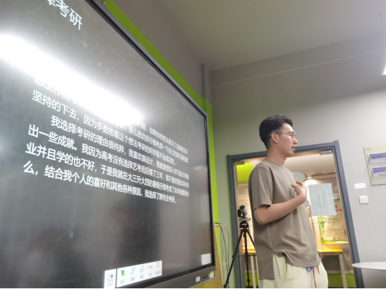 会上,设计学的栾逸飞分享了自己跨专业考研第一名的经验,从初试、复试两个阶段,按照各科的考试内容进行了详细的介绍。他提醒大家,端正的学习态度是十分重要的,要抓紧宝贵的学习时间,争取一战成硕。