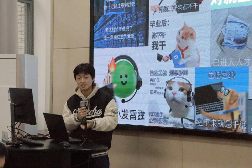此环节后,他们还邀请到了在海外留学的优秀学长代表,为同学们介绍了考取外校的相关事宜。优秀毕业生代表杨洋学长作为现互联网大厂职员,为同学们简述了他的入职经历。杨洋学长首先回顾了自己在学校的时光,介绍了其从专业成绩落后到接近满绩的逆袭过程。他强调了在大学期间积累专业知识的重要性,也告诉同学们不用为了一次的低分而焦虑。谈及求职经历,杨学长强调,求职过程中要充分了解自己的优势和不足,有针对性地提升自己的简历和面试技巧。同时,保持积极的心态和坚持不懈的努力也是求职成功的关键。