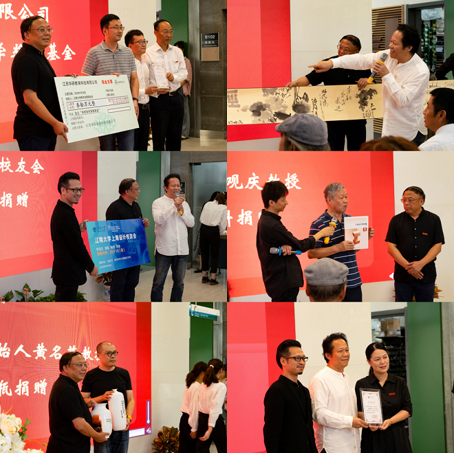 创始人黄名芊教授捐赠花瓶,退休教师刘观庆教授捐赠文献资料,上海设计校友会捐赠《风雨一甲子,桃李满天下》画卷及中秋节礼,江苏华研教育科技有限公司捐赠30万元设立华研奖学奖教基金,学院党委书记邱建平代表学院接受捐赠,校党委常委、党办主任朱飞、院长魏洁代表颁发捐赠证书。