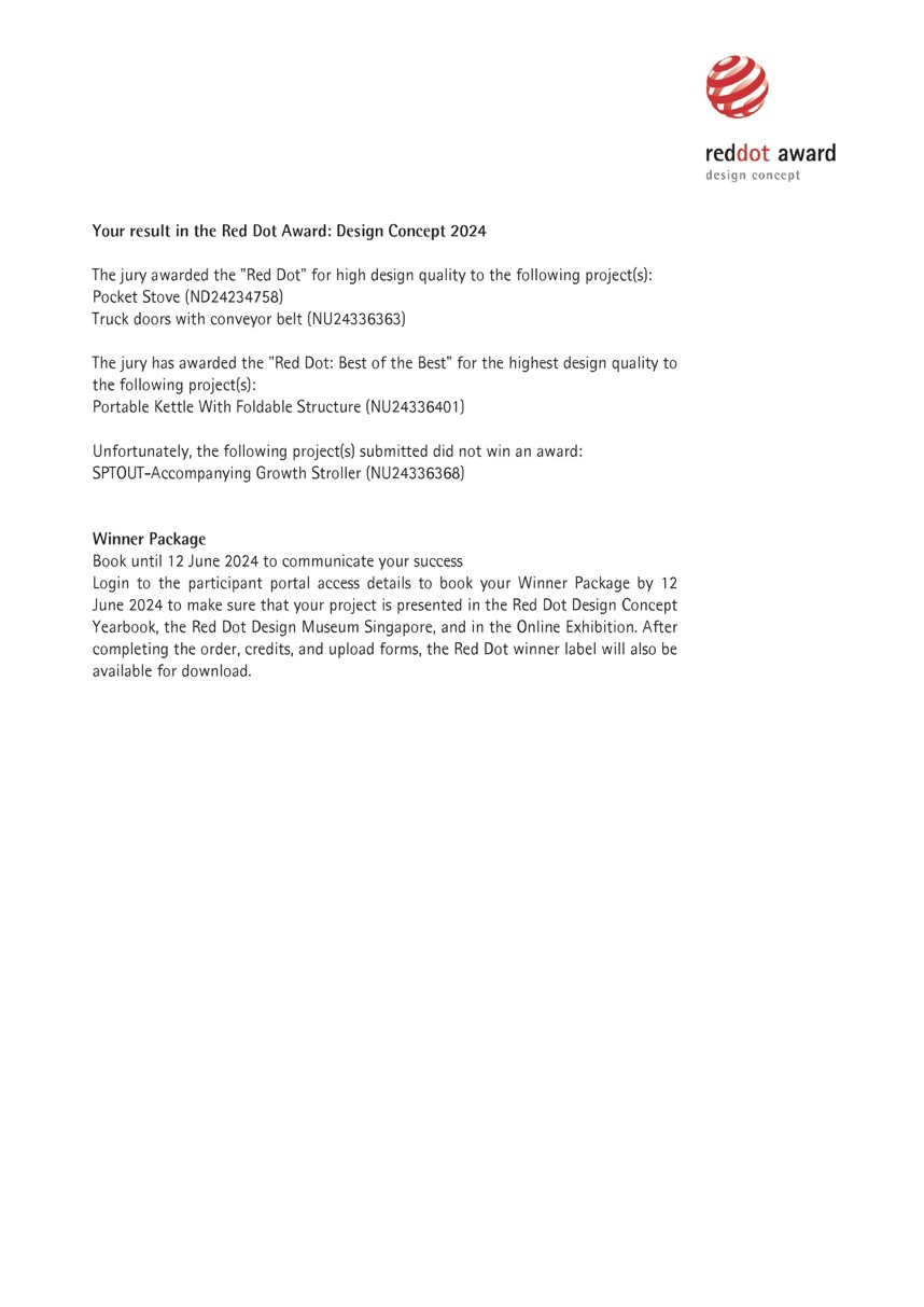2024年,红点设计概念奖再次揭晓,我院产品设计系主任钱晓波老师团队(2023级硕士研究生郭建宏、潘岁、邓凯睿)的作品《折叠烧水壶Portable Kettle With Foldable Structure》荣获Best of Best至尊奖,陈香老师团队(2023级硕士研究生潘岁、邓凯睿、郭建宏)的作品《货车尾板传送门Truck doors with conveyor belt》获得winner奖,作品皆以独特的设计理念和出色的设计品质在众多专业设计公司赛道参赛作品中脱颖而出。