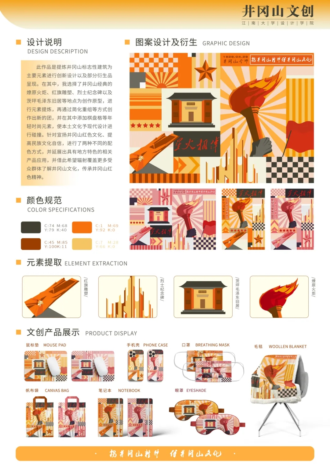 团队依托井冈山教育基地及其周边丰富的红色文化革命传统资源,积极探索井冈山斗争时期的党史故事,将视觉艺术与红色精神创新结合,以艺术语言去继承烛照民族复兴之路的井冈山精神,筑牢信仰之基、补足精神之钙、传承革命星火。通过前期调研,团队精心设计了活动海报和系列文创产品,用设计讲述红色故事,展现江南风采!