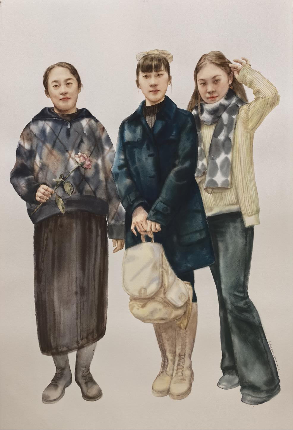 学生新时代的年轻面孔和青春洋溢的精神面貌。水彩的柔和质感与丰富色彩让整幅作品充满了生机和活力;作品在水彩人物画表现上进行了大胆的尝试,运用了中国画的线条,平面式的主观处理,作品不仅彰显了水彩的水色淋漓,同时作者进行了中西融合,将墨色运用于水彩之中,赋予了作品一种独特的情感表达方式。每一笔都用心描绘,传达出对青春和创造力的理解。作品中的清新氛围象征着无限的可能性和梦想的追逐,让人仿佛置身其中,感受到日本无码