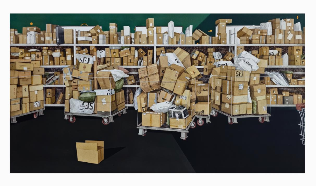 北区快递超市菜鸟驿站为背景,体现出物流行业近些年的发展与变化,运用了繁杂与简明的对比,将丰富的快递居中在画面中间以黄色为主色调,背景则用黑绿两色衬托,加之肌理的变化,和一点抽象符号的运用,呈现现代物流行业的活力和希望,同时也希望观者能感受到物流行业在现代社会中的重要性以及物流时代的进步。