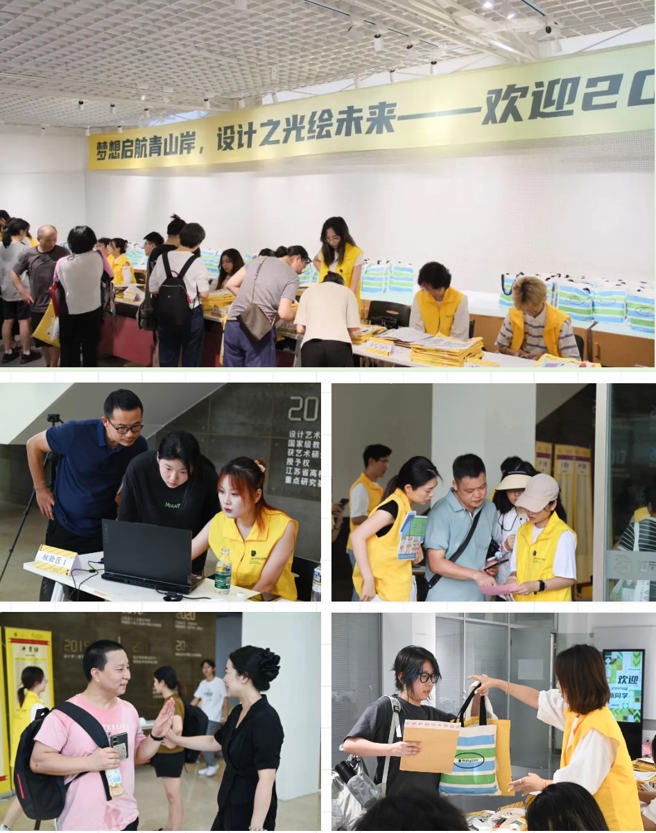 报道现场如火如荼,院楼内,核验、物料、互动、拍照四大专区异彩纷呈,定制徽章、挂件、帆布袋、babycare生活用品等入学大礼包惊喜不断;院楼外,大家都神采奕奕,正在用自己的专属卡通形象徽章点亮设计强国的新地图。这一刻,青春的注脚被赋予了新的定义,“青山设计,设计未来”也有了新的传承。