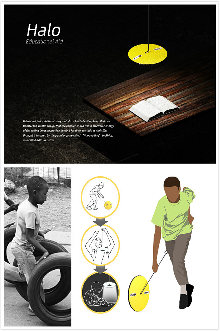 设计说明:世界银行与国际能源署(IEA)日前发布报告称,非洲大陆是全球人均用电量最低的地区,2014年非洲仅有37%的人口能够用上电。目前全世界约有16亿人无电可用,其中45%来自非洲农村地区,另有10%非洲城市人口无电可用。电力短缺已成为制约非洲大陆发展的重要因素。在非洲的许多农村地区,缺电导致大量学龄儿童缺乏必要的阅读照明条件。Halo既是一款儿童玩具,也是一款吊灯,可以把儿童滚动它的动能转化为吊灯的电能为夜间学习提供照明。它的灵感来自在非洲广为流传的Hoop rolling游戏(滚铁环),在Eritrea又被称作“INKIL”。使用时,用户将带有挂钩的铁丝插入圆盘的中心,然后跑步推动圆盘滚动与其他玩家竞速或者越障。圆盘滚动会带动内置的发电机发电并储存起来,到了晚上用户可以使用铁丝将内置LED灯的圆盘挂在高处作为吊灯使用。这款产品的愿景是在为当地儿童提供学习条件的同时,为他们的课余生活增加乐趣。