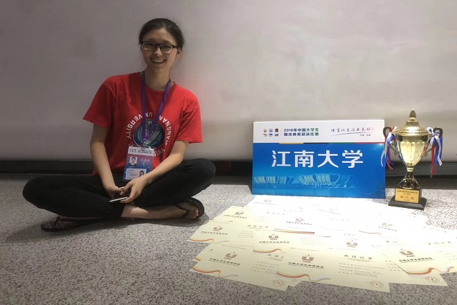 表演1701班学生,自2017年加入校游泳队以来,三年里近2000小时、1920公里的水下训练,代表学校参加四项国家级、一项省级比赛,共斩获一金九银三铜战绩。2018年省运会,学校游泳队以团体总分169分创历史最高成绩,她独揽49分;同年7月,作为队长带领团队出征中国大学生阳光体育游泳比赛,创女子团体总分第三名的历史新高,并获道德风尚奖。此外,她连续三年成绩保持专业第一,获校长特别奖、国家奖学金、优秀大学生宣讲团成员等35项校级及以上荣誉,目前已保送我校设计学(服装设计方向)专业攻读硕士研究生。