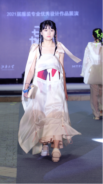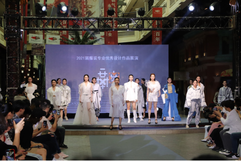 随后,举行了2021届服装专业优秀设计作品发布会。本次作品汇演主题是“融”:文化与自然生态和谐交融。服装专业的优秀设计师们运用手中的丝线,融合自己对未来的美好期望,幻化出了一件件萌动与灵动、羞涩与不羁、谨慎与大胆、狂放与优雅交融的设计作品,近150件优秀毕业设计作品参加了本次展演。