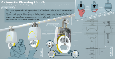 设计说明:此设计针对疫情及后疫情时期,为促进城市经济恢复,稳定民心,使人们在出行乘坐公共交通工具时,能够放心,我们将人们普遍接触的拉手进行了一系列结构创新,使其能够通过物理齿轮发条传动效果,实现拉手在人手离开后自动旋转消毒,以便后续使用的清洁性。在消毒方面,我们采用了紫外线消杀,消毒更加彻底安全,且物理结构之下,此款产品环保安全,在材料的选择上,我们也选择了PLA+PBS可降解塑料,及具有记忆性的塑钢,在环保之余增长了产品的使用周期,以便于减少资源浪费,环境污染现象。