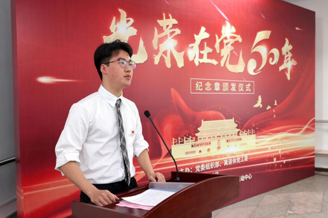 学生新党员代表姜晟晨表示,“光荣在党50年”纪念章颁发仪式不仅是对党员前辈们的“最高礼赞”,更是对年轻党员的“最好激励”。作为青年学生党员,要学习前辈们的光荣事迹;延续前辈们的赤胆忠心;继承前辈们的崇高精神,弘扬青山精神,做怀有初心和使命的“设计者”。