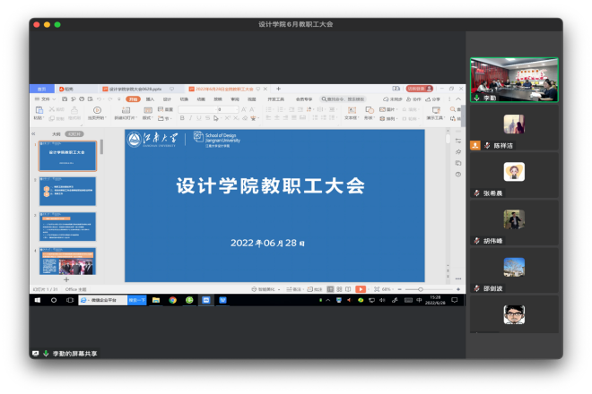 会上,魏洁院长结合学院任期目标建设完成情况介绍了学院学科发展,特别是在一流专业建设、软科学科排名等方面取得的积极成效,鼓励全体教师团结合作,共同为一流学科创建贡献力量。各分管副院长分别结合各自分管工作进行了学期工作交流。党委副书记、副院长王晖以“多维联动,高效协同”为题从青年季、劳动季、就业季、毕业季四个方面介绍了近期对青年学生教育引领和毕业就业等相关情况;杜守帅副院长对照任期目标任务总结了学院科研项目申报情况,重点介绍了国家社科基金、国家艺术基金项目方面取得的突破进展;潘春宇副院长介绍了国际交流工作取得的进展情况并分享了下一步工作思路;曹鸣副院长介绍了本科教学工作情况,介绍了优秀毕业设计在线展览的情况,并重点就“设计青山”前瞻计划进行了介绍;廖曦副院长介绍了研究生招生录取和毕业工作情况,通报了研究生暑期工作营、实验室安全等工作情况。