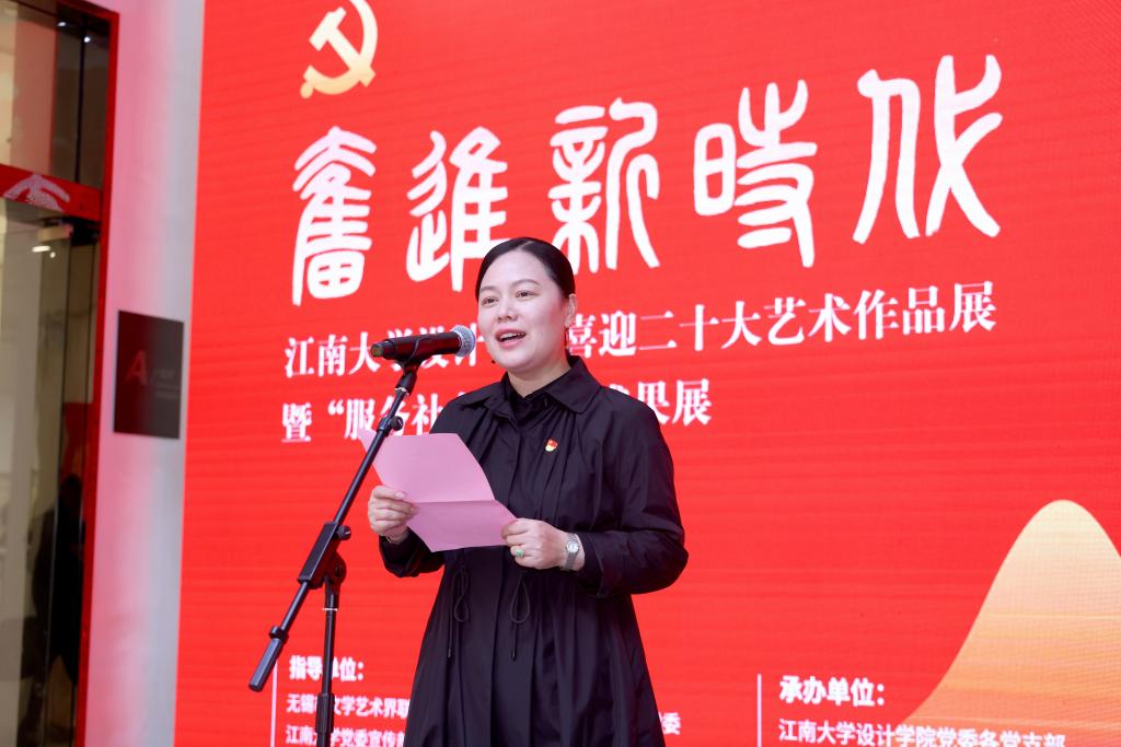 院长魏洁致欢迎辞,她表示此次展览反映了时代风貌、彰显了时代精神,融思想性、艺术性、教育性为一体,从多维度的视角和多样化的形式,展现了党的光辉历程和不朽功勋。同时展览期间同步举办师生服务社会设计成果展,这是学院师生认真落实习近平总书记在清华大学考察时的重要讲话精神的领会贯彻。她指出,设计学科作为一个实践性较强的学科,承载着推进社会主义文化强国建设的使命和任务。我们要用设计智慧服务国计民生,服务社会需要,服务行业发展,展现设计力量。