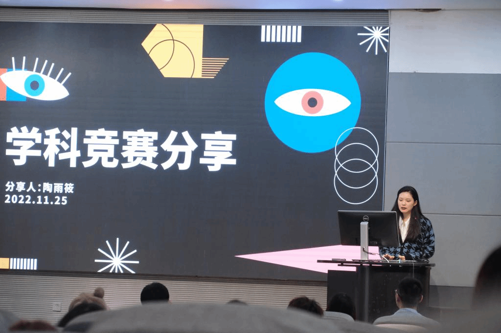近几年获奖情况,并以学长的身份表达了对同学们踊跃参与竞赛的期望,希望同学们能够根据自己的兴趣选择适合自己的比赛,不断提高自己的科创能力。陶雨筱以全国大学生广告艺术大赛为例,向大家分享了自己的创作思路,表示好的参赛作品一定要避免俗套、善于运用自己熟悉的表现手法,并建议大家在选择参赛主题时可以避开热门主题,这样可以增加获奖机会。葛舒羽以红点至尊奖为例,介绍了同学们在投比赛时应该注意的事项,鼓励大家要提前谋划,多和专业课老师沟通商量,并对作品的原创性提出了建议。