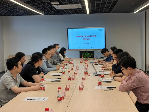 会上,张丹丹代表学院对我院教师一行的到访表示热烈欢迎,并就学院的发展现状、未来发展的总体定位和学科特色党建进行整体介绍。常丹妮全面介绍了学院的基本情况、学科建设、师资队伍和人才培养等方面的先进理念与经验做法,着重分享了学院以项目驱动带动学生创新发展的经典案例,表示学院一直致力于培养学术研究与设计实践相结合、科学与艺术相融合的创新设计人才。韩挺详细介绍了学院的专业分类、产学研现状及设计学科发展的整体规划框架。