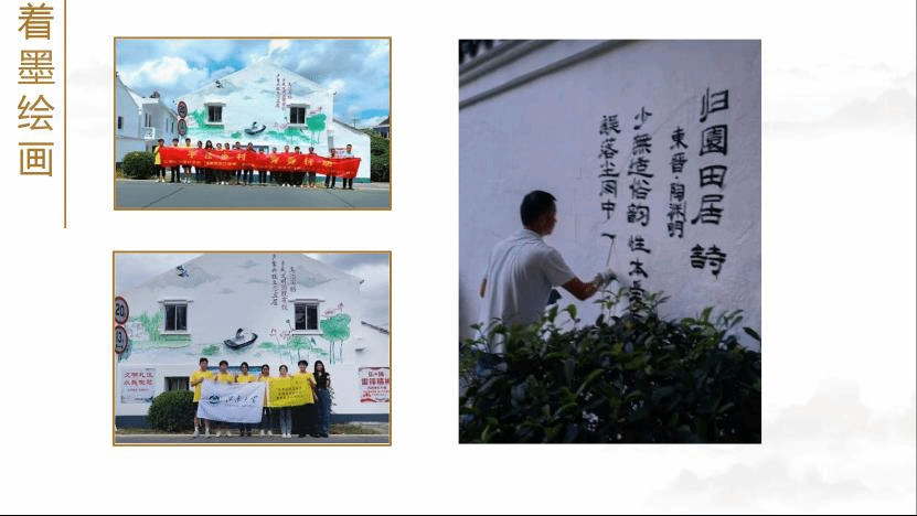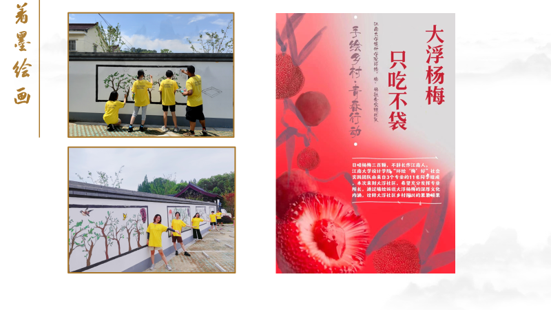 探索设计赋能,聚焦乡村振兴。手绘乡村青春行动分为“环绘‘梅’好” “‘淹’雨春秋” “笔墨挥洒江南情,前瞻设计颂党恩”三个部分传递了乡村文明,用手绘赋能乡村振兴,助力乡村建设。