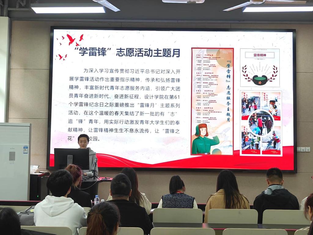 在第61个学雷锋纪念日之际重磅推出“雷锋月”主题系列活动,在这个温暖的春天集结了新一批的有“志”追“锋”青年,让“雷锋之花”香溢校园。4月19日,学院于A104召开“雷锋月”主题总结暨第一届志愿之星表彰大会,院学工办主任兼分团委书记吴雨琛、校团委副科级干部王牧、院辅导员滕影、校青年志愿者协会主席杜添媛、“益”起设计志愿服务团队、食品安全进社区团队以及志愿之星代表参与会议。会议由院分团委志愿服务部部长李聪妘主持。