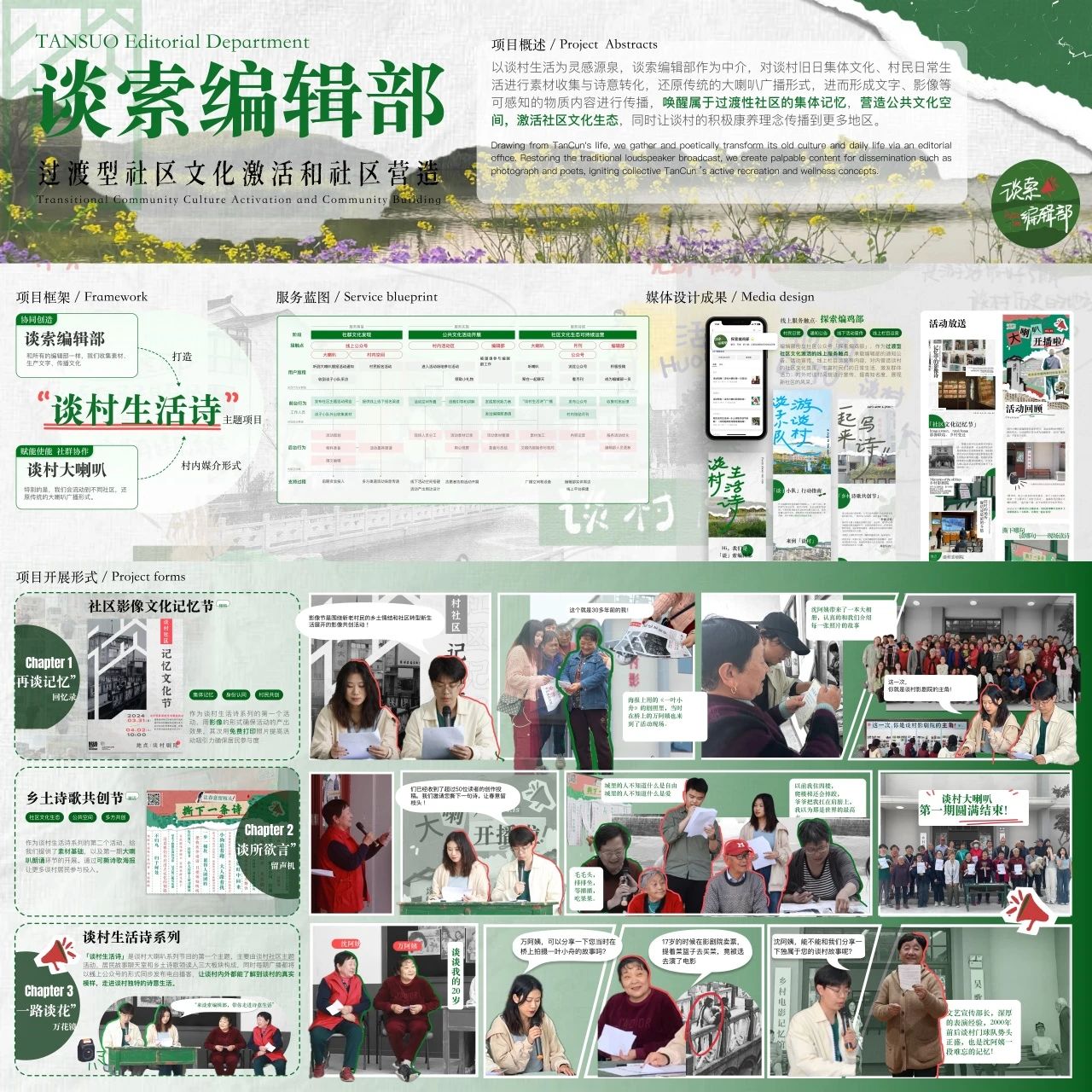 优秀奖作品——“谈索编辑部 一过渡型社区文化激活和社区营造”聚焦地方文化生态的再激活与过渡型社区营造,落脚无锡谈村,以编辑部的形式介入,对谈村旧日集体文化、村民日常生活进行素材收集与诗意转化。在村内还原传统乡村大喇叭的广播形式,唤醒属于过渡性社区的集体记忆,营造公共文化空间;在线上通过运营公众号和播客向外传播谈村文化,延续全新文化生态。项目以地方文化为灵感源泉,以旧形式焕新记忆,以村民自治推动积极康养,希望通过设计实践助力村民角色身份的积极转变,发掘出一套过渡型社区文化激活工具包,适应其他过渡型社区的文化生态激活与延续。