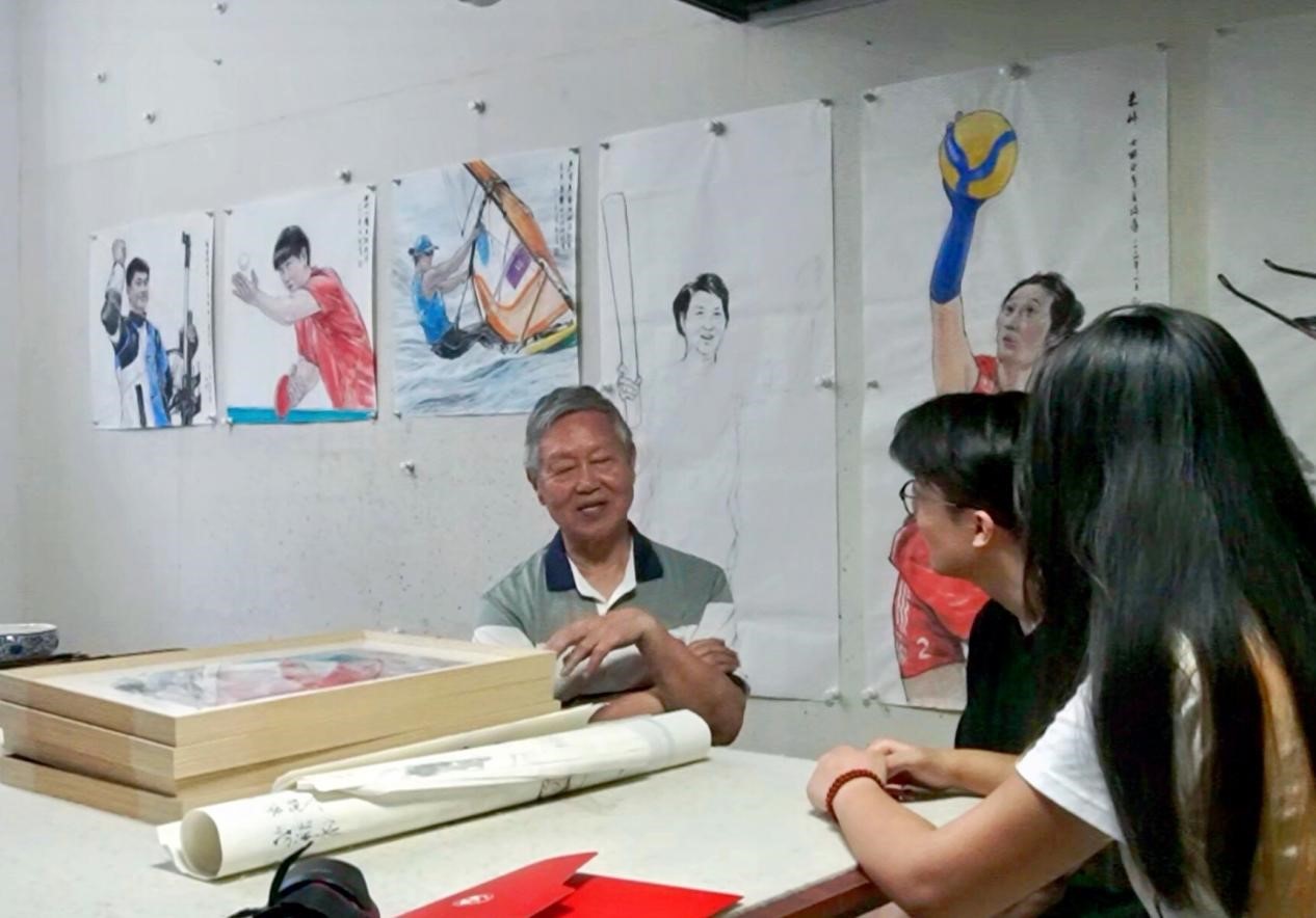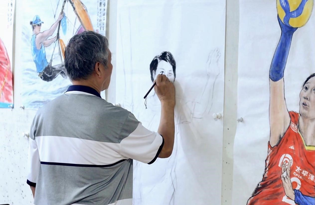 刘教授专心绘制奥运英雄画像