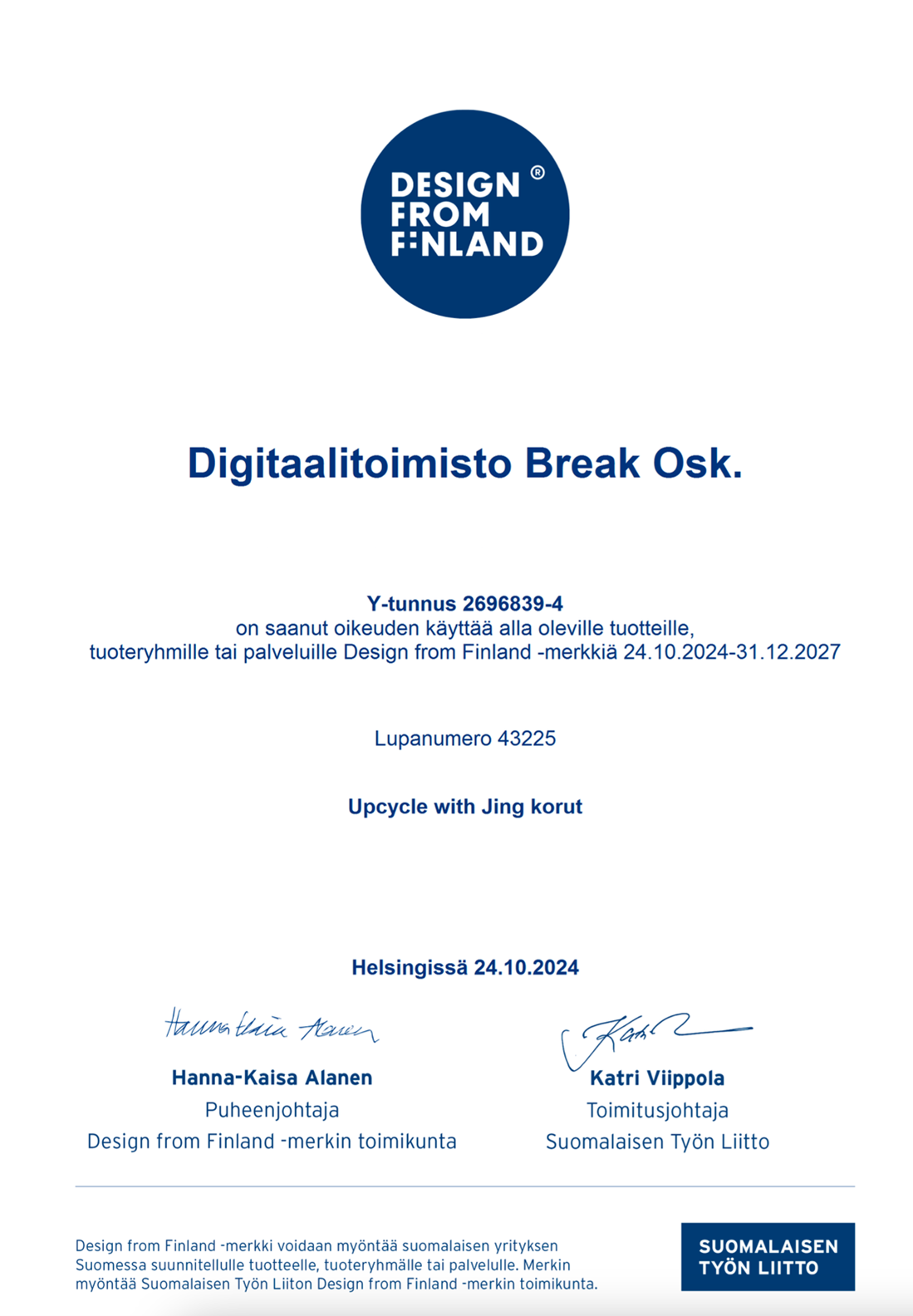 带着对可持续设计的高度认同和对产品设计创新的无限热爱,汪婧的Upcycle with Jing把废弃的塑料瓶打造成了每年芬兰总统府国宴上都会出现的时尚品牌,品牌已获得“Design from Finland”与“芬兰钥匙旗(Avainlippu)”两项权威认证,产品进入芬兰设计博物馆商店、MUJI 芬兰、Kämp Galleria,并成为Stockmann 百货网店的特别合作品牌。