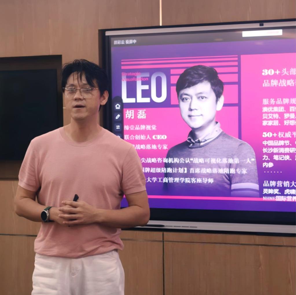 接着,缔壹品牌视觉联合创始人兼CEO胡磊以“战略可视化”为主题分享,他结合自身的实战经验,通过生动的案例,指出战略可视化是建立一整套品牌战略沟通系统,让设计与品牌需求深度适配,传递品牌差异化价值,启迪了同学们如何去看清商业本质,并在未来用新视角思考专业和工作价值。