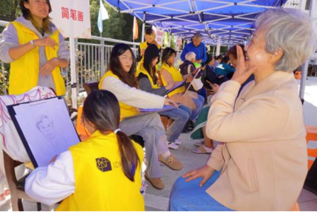 不同风格的画作都戳中了老同志们的心。当他们接过肖像画时,先是低头细细端详,接着互相传阅,嘴角藏不住笑意:“太传神了!这就是我现在的样子,比照片还有意思!”“这漫画把我画得真精神,还有点像我年轻的模样!”温暖的阳光洒下来,落在老同志们的白发上、同学们的黄色马甲上,也落在一张张鲜活的肖像画上,暖意融融。