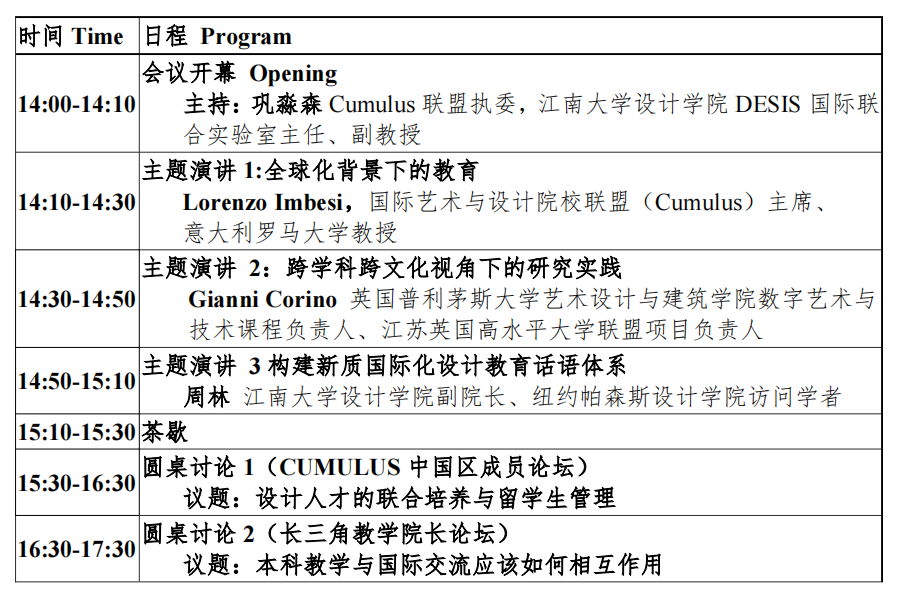 China's design education has developed with the tide of globalization. On the one hand, contemporary design education in China is the product of international cultural exchanges, and on the other hand, economic globalization is the driving force for the vigorous development of design education. Therefore, design and design education have the essential characteristics of globalization, and the tide of globalization will inevitably promote the surge of design education. The purpose of this forum is to discuss how design education shall face the challenges and opportunities in the new wave of globalization: how to effectively use international resources and cooperation, how to adhere to the core values and spirit of design education, and how to take into account traditional cultural heritage and cross-cultural export ability in design teaching. As one of the first batch of units to join the Cumulus Alliance in China and the current Cumulus Executive Committee, the School of Design at Jiangnan University hopes to take the conference as an opportunity to discuss design education under the new tide of globalization with Cumulus members and partners across the globe.