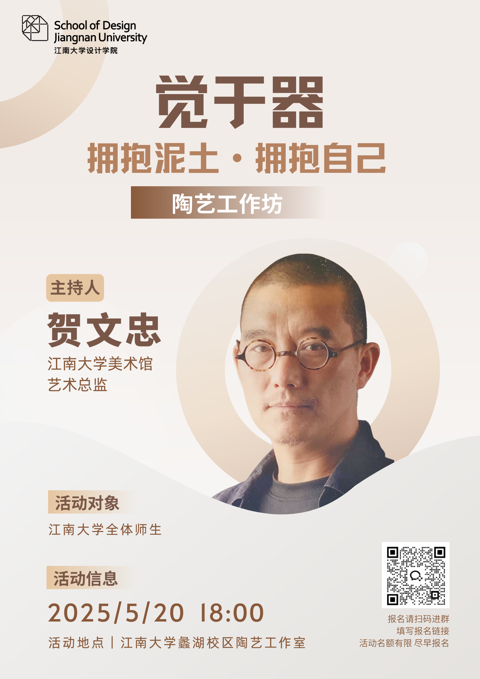 美术馆艺术总监贺文忠老师主持,与大家一起拥抱泥土,拥抱真实的自己。我们希望借由这次的体验工作坊,帮助同学们在创作过程中宣泄情感、重塑生活态度、激发持续的探索动力。陶泥塑心,指尖疗愈,愿每一位参与的同学都能够在自然材料与手作艺术的陪伴下,转换能量、重拾心性,体验心理疗愈的美好旅程。