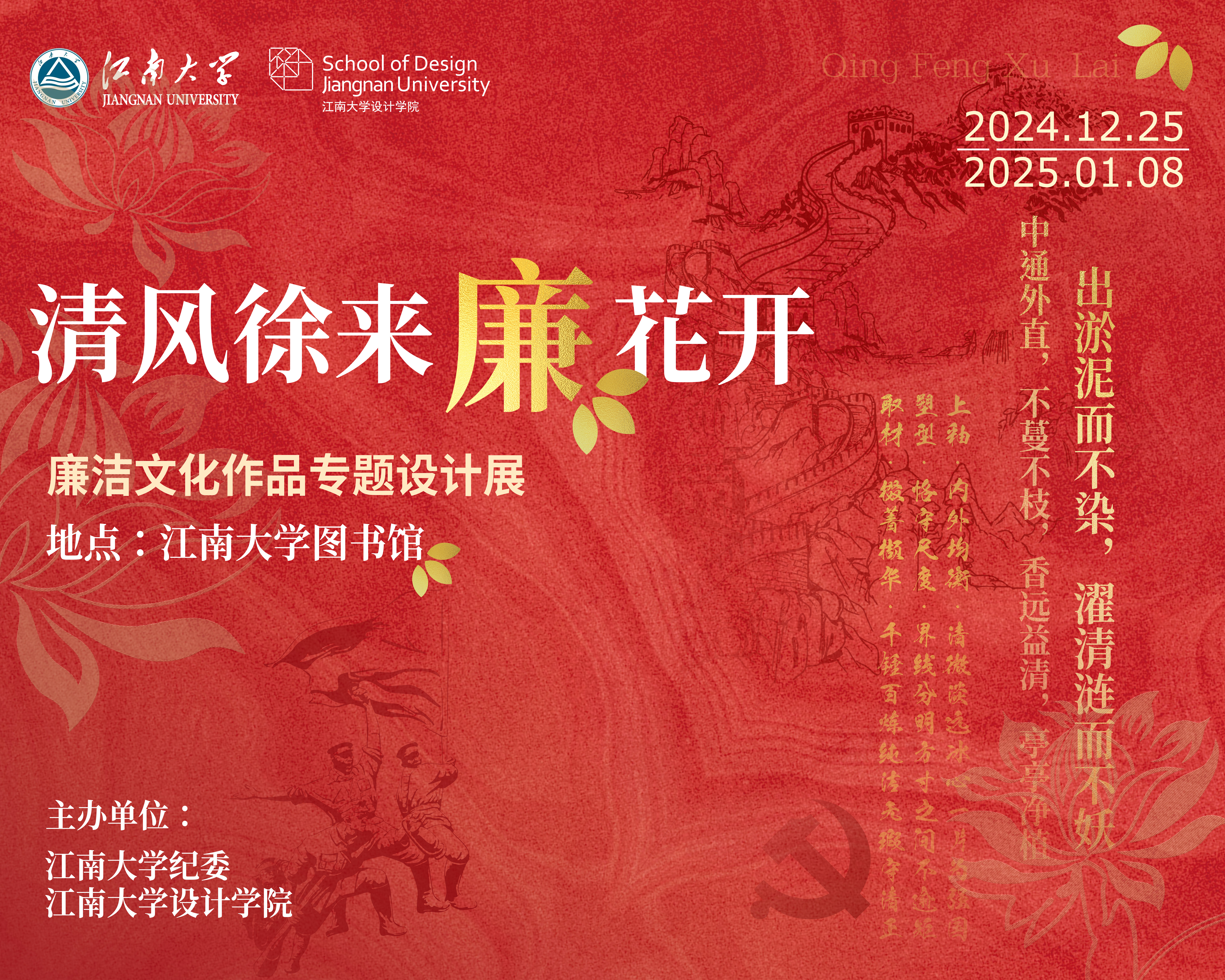学生党员、学生骨干,通过挖掘传统经典、文物古迹、校园文化等蕴含的廉洁元素,创作了丰富的宣传海报、公益广告、文创设计等平面创意作品,旨在充分发挥廉洁文化教育人、鼓舞人、激励人作用,充分展现新时代新青年风清气正、向善向上的美丽画卷。