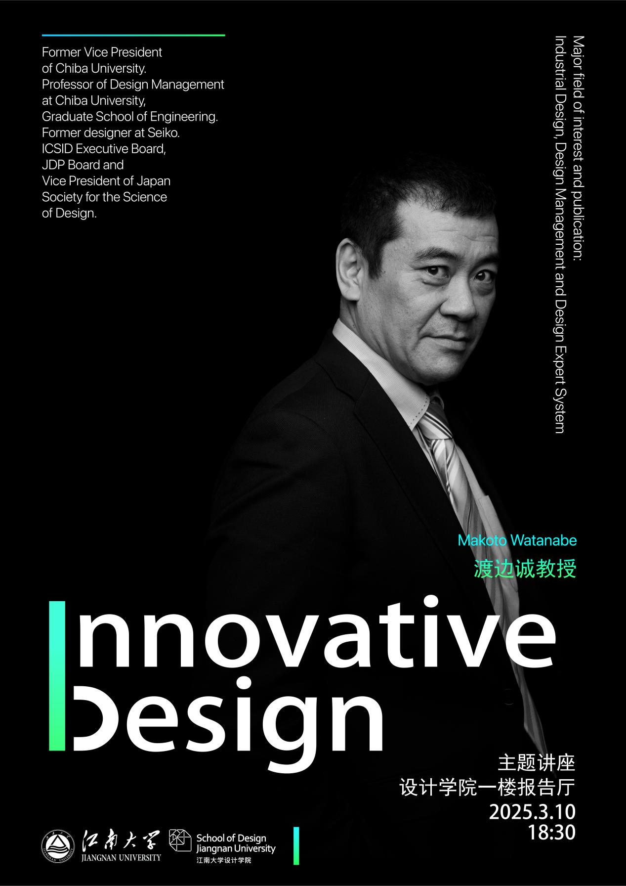 渡边诚教授是日本国立千叶大学前副校长、国际学术研究院教授、浙江大学、南京艺术学院、广州美术学院等高校的客座教授,千叶大学SPD项目和GADSP项目负责人、Cumulus全球艺术设计高校联盟执委、日本设计产业振兴会优良设计大奖(Good Design)顾问。曾担任日本设计学会副会长及国际工业设计学会、世界设计组织执行委员会理事。