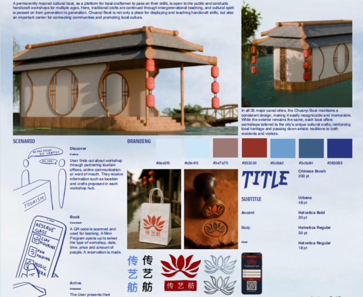 来自法国的Lilou Mouilleron-Becar谈到,设计工作坊里,大家不再是中国传统文化的旁观者,而是跨文化设计的创作者。他所在的小组以“江南”为灵感源,将古运河的航运记忆浓缩成“传艺舫”。这艘永久停泊的文化船,则以运河船只为载体,聚焦传统工艺传承,通过现代设计打造跨年龄层的实践工坊,既守护了地方文化与工艺,又强化了社区与运河历史的联结,体现了对文化传承方式的独特思考和创新设计能力。