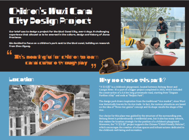 经过学习,欧洲留学生们能够很好地将文化元素与实用功能融合进作品中,展现出了他们对江南文化的深刻理解和出色的创意表现力。其中,“回声故事穹顶”作品将降噪功能与无锡运河文化传播相结合,以互动故事的形式让儿童感受文化,既具实用性又充满人文关怀,展现了对当地文化场景的细致观察与创新转化。