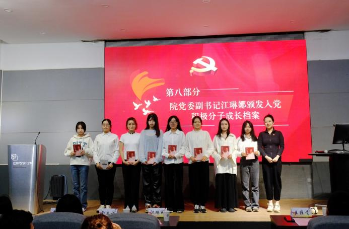 一份入党申请书,就是一份对党的承诺;一份积极分子成长档案,就是一份向党组织努力靠拢的证明。本次培训班采取线上理论学习与线下活动打卡的双线培训制度,线下打卡依托“入党积极分子成长档案”进行,学员们参加培训班内的必修活动和培训班外的党团活动、志愿服务等都可登记在册。在这一环节,学院党委副书记兼副院长江琳娜向培训班学员代表颁发入党积极分子成长档案,希望这份档案能够记录下大家思想成长的每一步、行动前进的每一处。