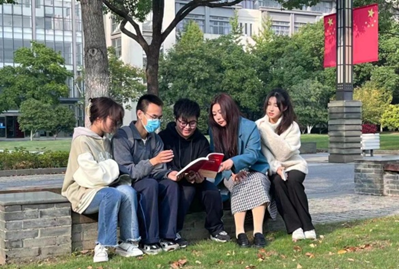 服艺2202班同学于图书馆前阅读红色书籍