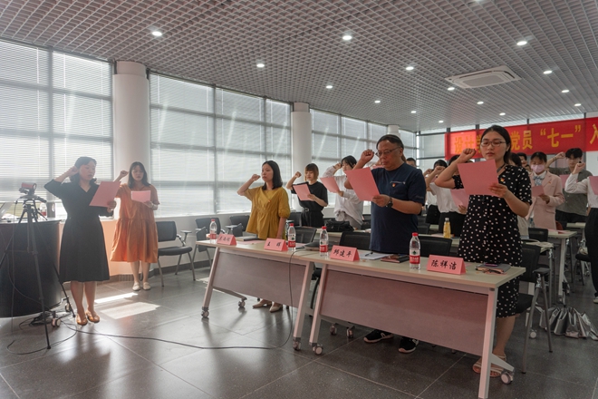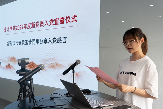 面对鲜红的党旗,在党委副书记王晖的带领下,全体与会党员举起右手、握紧拳头,以铮铮誓言表达时刻以人民为重,时刻以党员的标准严格要求自己,时刻以党员的先进性鞭策自己,坚定不移的听党话、跟党走,薪火相传、接续奋斗的信念和决心。宣誓结束,工业设计2002班袁玉倩代表新发展党员进行发言,她带领大家回顾了党的百年奋斗历史,并代表新发展党员做出了对党组织的三点保证:坚定不移听党话,跟党走;锐意创新,感应时代脉搏;牢记宗旨,锤炼品德修为。