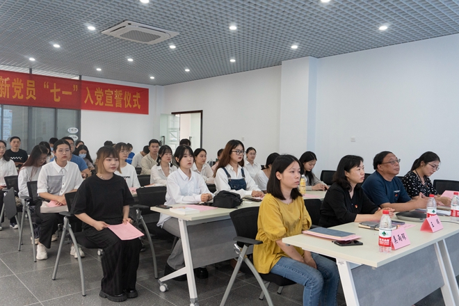 宣誓仪式在庄严的《国歌》中拉开序幕,全体参会党员在豪壮激昂的旋律中,共同体悟中国共产党的红色精神和永恒信念。随后,党委书记邱建平和党委副书记王晖为新党员代表颁发《中国共产党简史》和党徽,并向他们表示热烈的欢迎和衷心的祝贺。
