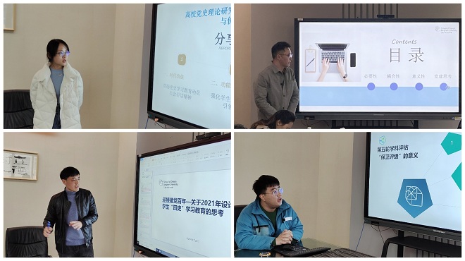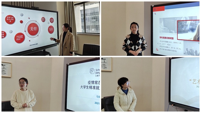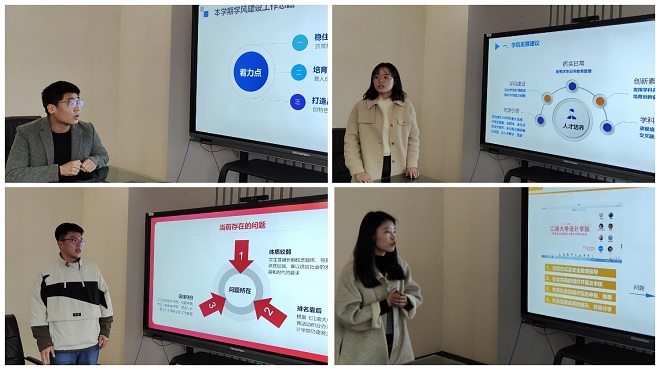 学风建设将着力“稳住基本盘”、“培育增长点”、“打造品牌化”三点,此外,他还围绕“建党100周年”提出“艺心向党”七个“一”活动方案。章琳对学院的发展提出“抓实日常”、“创新素质培育”、“学风建设”、“党建引领”、“学科交叉融合”五点思考,结合分块工作,她认为本年度重点工作应围绕“加强党建与思政工作”、“强化典型选树引领”、“抓实日常管理教育”展开。纪欣卓以“党建引领,文体日新——助推学院文体工作高质量发展”为题进行探讨,从当前问题——解决思路——未来举措三个板块精细剖析。王唯围绕“大学生社会实践与志愿服务”进行思考,她从党建带团学视角指出,以”党建+”为载体构建实践育人体系、以“党建+”为载体助推服务育人的时效性。