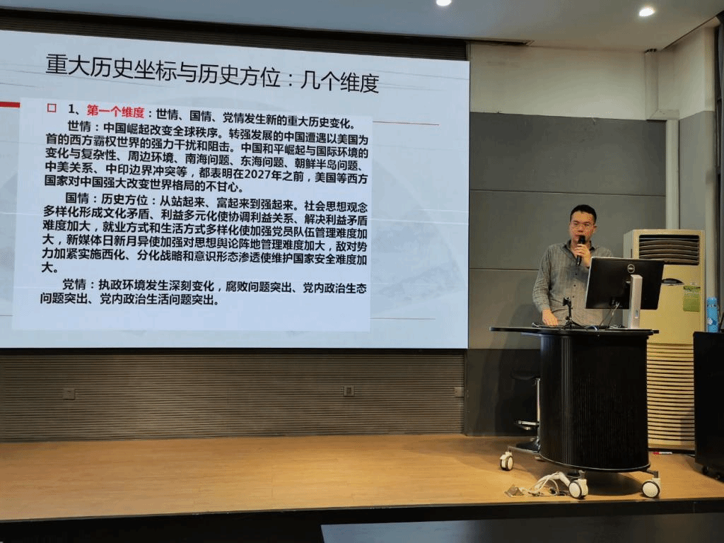 首先,郑老师从多个维度入手,谈了我国可能面临的挑战。听了习近平主席对待这些问题坚定不移的讲言,不禁心生自豪。郑老师着重“世情、国情、党情”的深刻变化、由富起来到强起来道路上面临的三大潜在陷阱“拉美陷阱、塔西陀陷阱、修昔底德陷阱”等方面作了认真严肃的讲演。