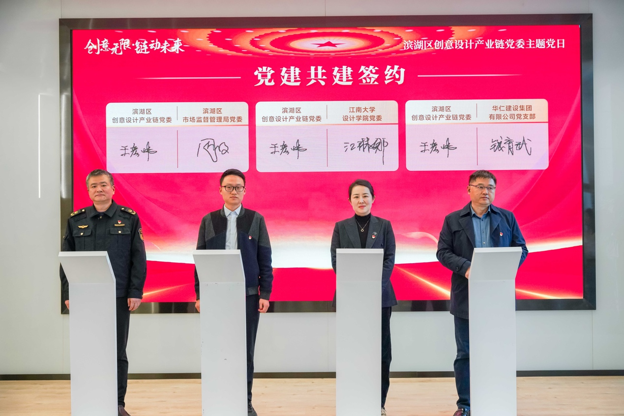 党委与滨湖区创意设计产业链党委、滨湖区市场监督管理局党委、华仁建设集团有限公司党支部签订党建联盟协议,为进一步加强创意设计产业链上政、院、企各方党建共建合作交流提供平台保障。